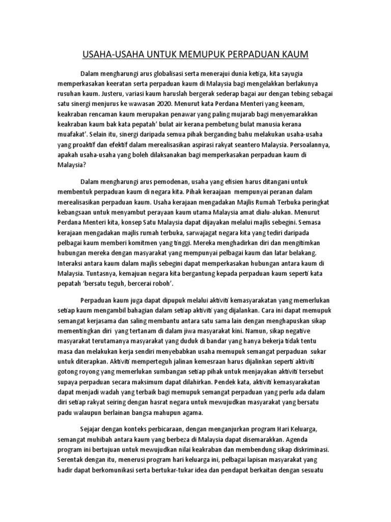 Sebenarnya kita bolehlah mengadakan aktiviti gotong-royong di taman-taman perumahan. Contoh karangan perpaduan kaum bahasa melayu terbaik bagi pt3 spm stpm.